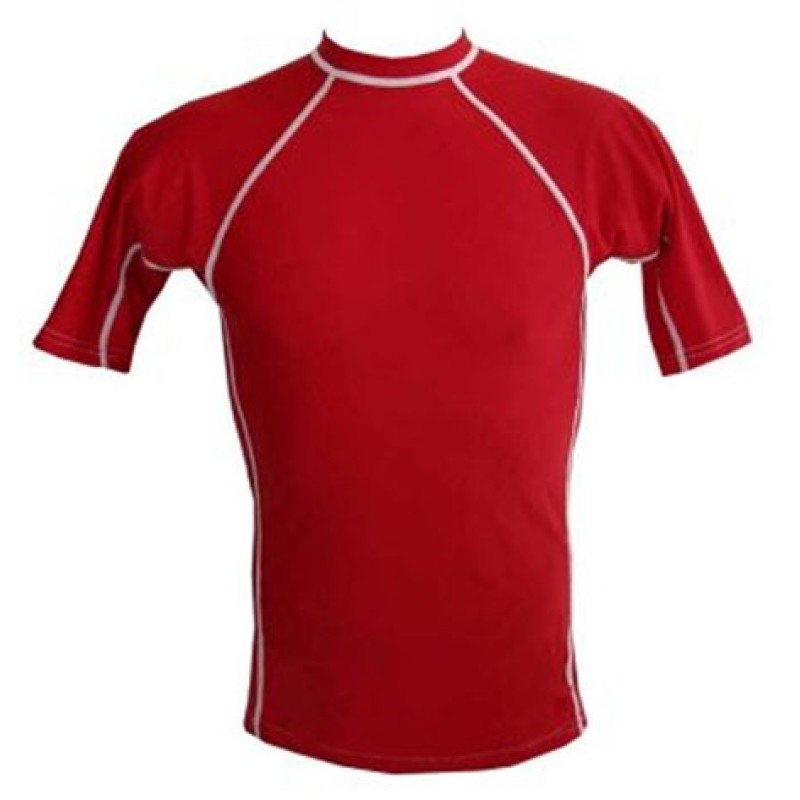 Comfortable medium red with white thread short sleeve rash guard made of 100% polyester/spandex fabric keeping you comfortable and dry Available in short and long sleeve also available in any regular color combination with require logo/art work